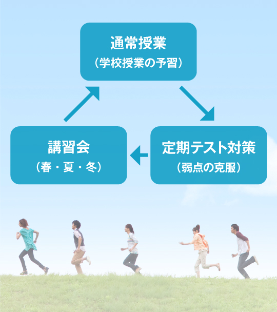 通常授業では予習型授業を行い、学校の授業が復習になるよう指導しています。そして定期テスト前までに対策授業を何度も繰り返し出題範囲を学習していきます。長期休みには、それまでの総復習や新学期に向けた準備、志望校別の受験対策など、長期休みならではの学習計画をご提案しています。